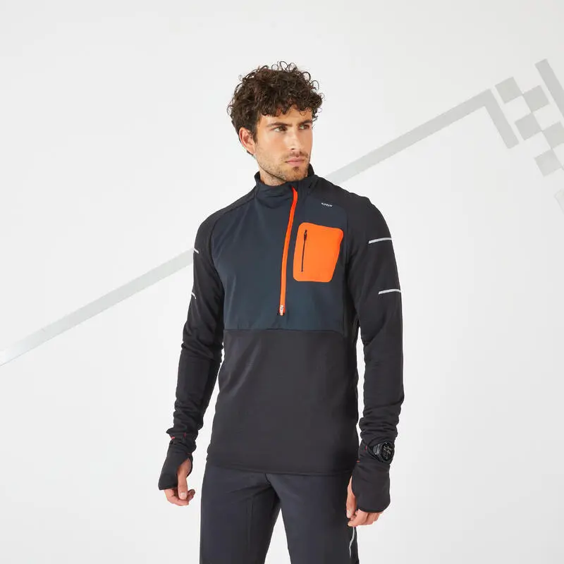 Compra en Decathlon Camiseta running manga larga con cremallera Kiprun Warm Camiseta de manga larga de running de invierno para hombre cálida y transpirable para correr con tiempo frío. Con aberturas para los pulgares y con manoplas.